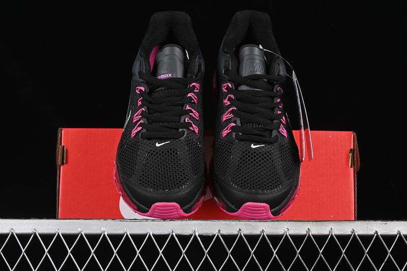Las Nike Air Max 2013 destacan por su unidad Max Air completa y su diseño técnico. Sobre una base oscura en negro y gris, los vibrantes toques de "Fusion Pink" y los detalles en "Metallic Silver" crean una estética enérgica y atrevida, fusionando rendimiento y estilo.